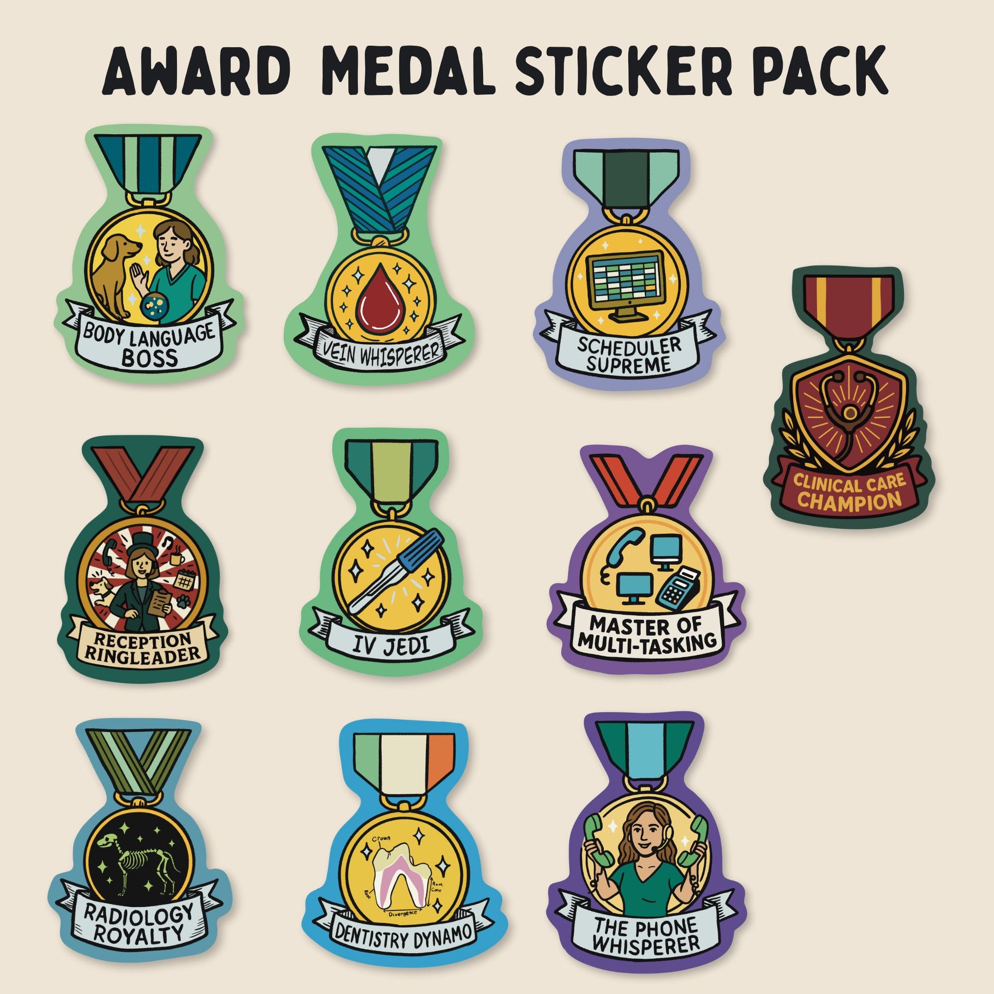 Ten waterproof matte vinyl stickers celebrating the real MVPs of veterinary medicine. Each medal calls out a role every clinic relies on, whether it gets recognized or not.