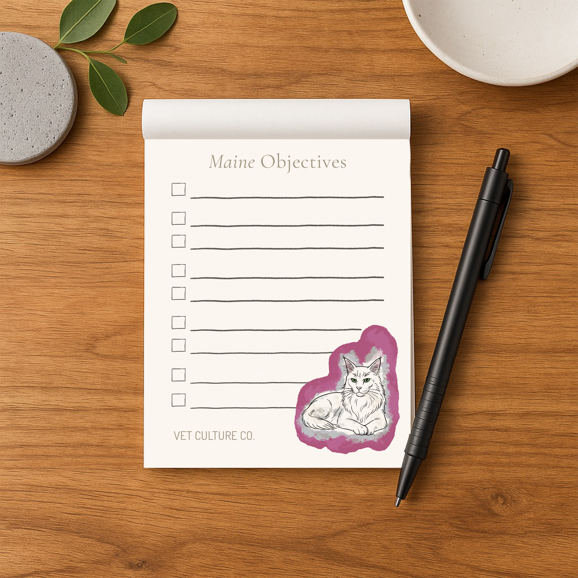 This A2-sized notepad is small but mighty — like the cat that inspired it. Featuring the full-color Maine Coon design on every page and a cheeky title at the top (“Maine Objectives” — get it?), this pad is ready for whatever your shift, to-do list, or personal meltdown throws its way.